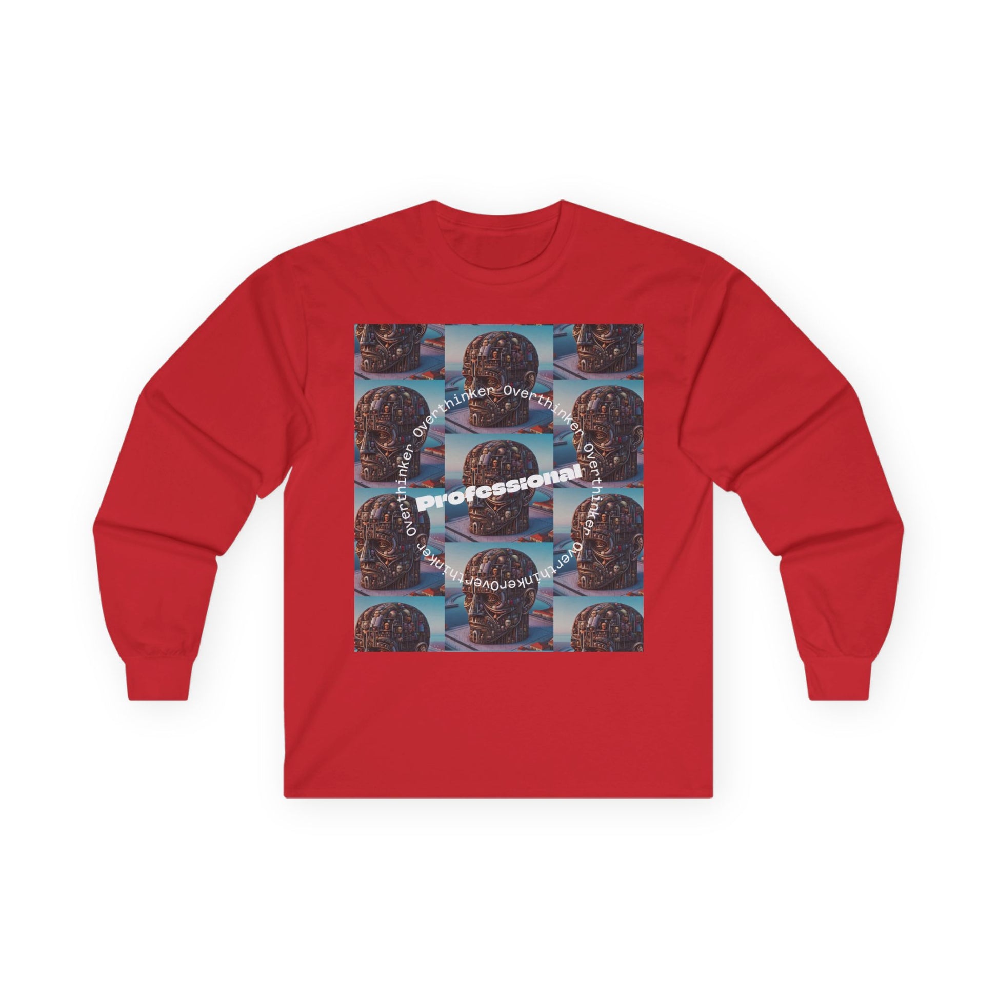 A professional overthinker long sleeve tee featuring a head figure that appears as a library full of books. This tee gives off a scholarly vibe and is perfect for those who love to ponder and analyze. Ideal for book lovers, academics, and intellectuals. Relevant for birthdays, holidays, and casual everyday wear.